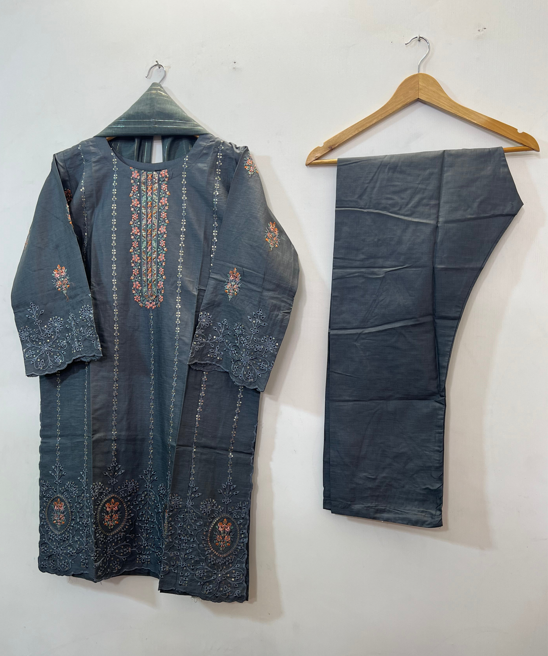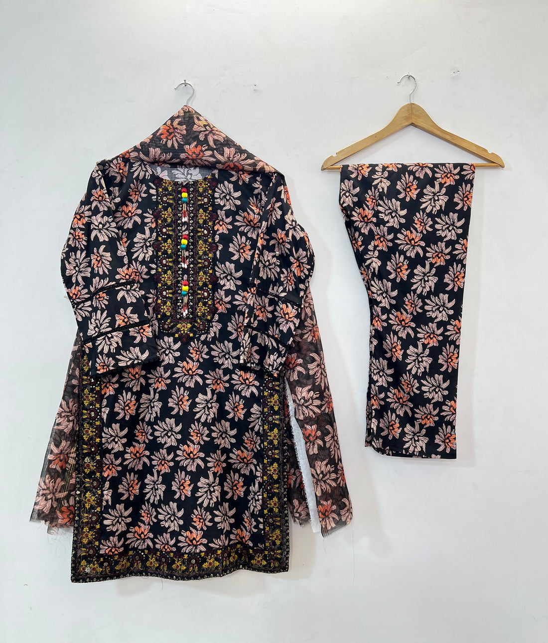 3-piece printed premium lawn outfit, adorned with intricate thread embroidery on neckline and sleeves and...