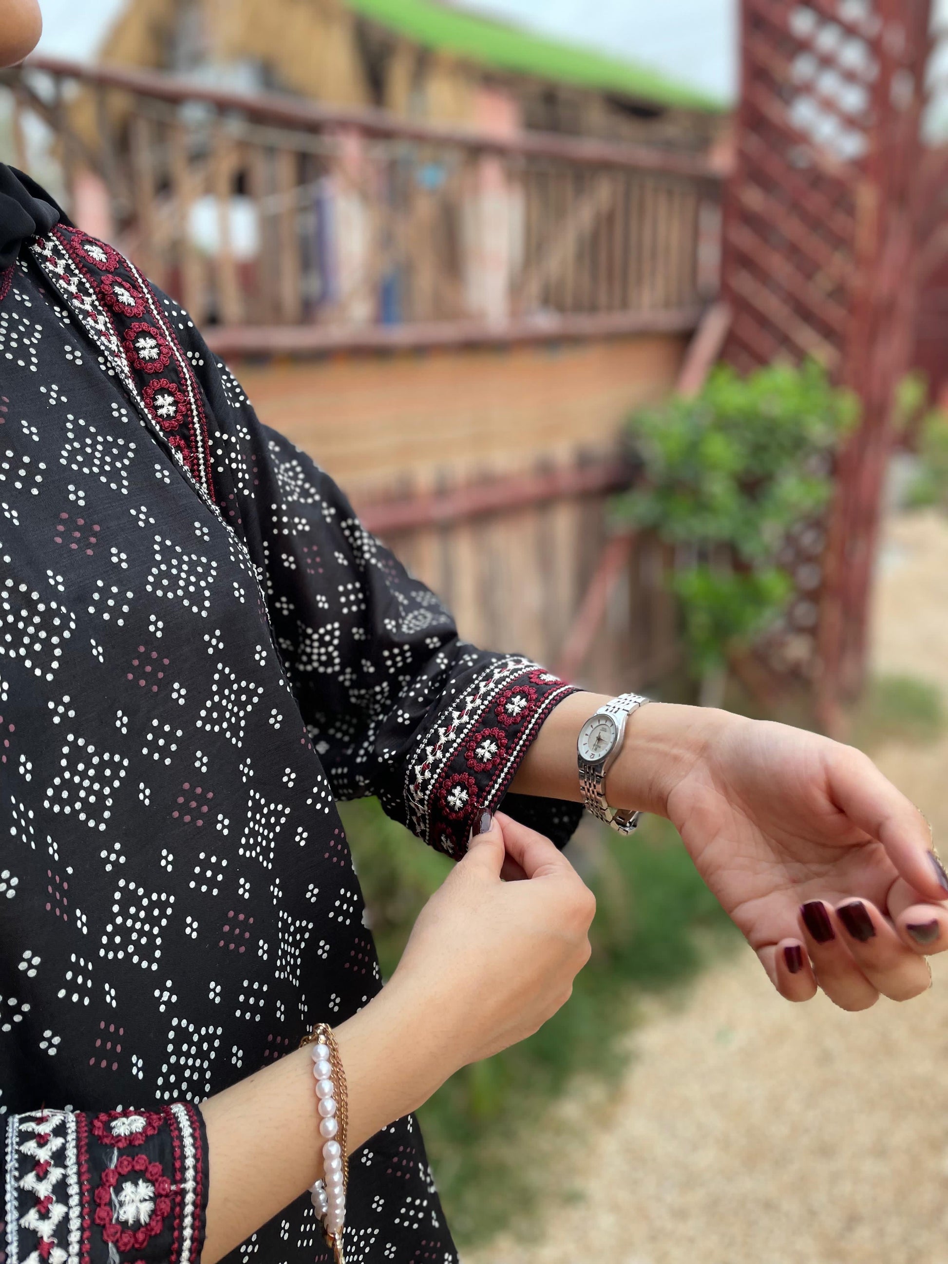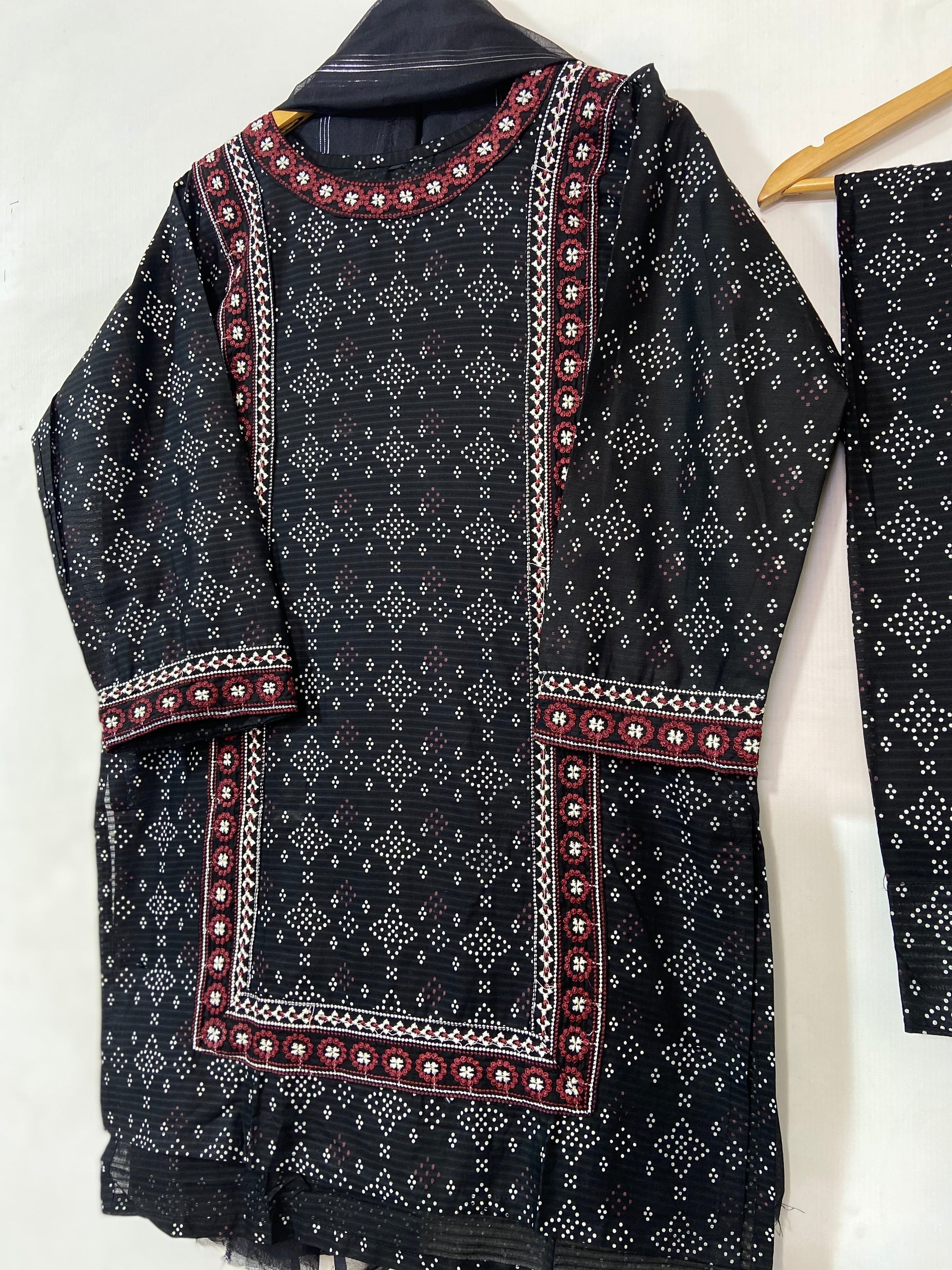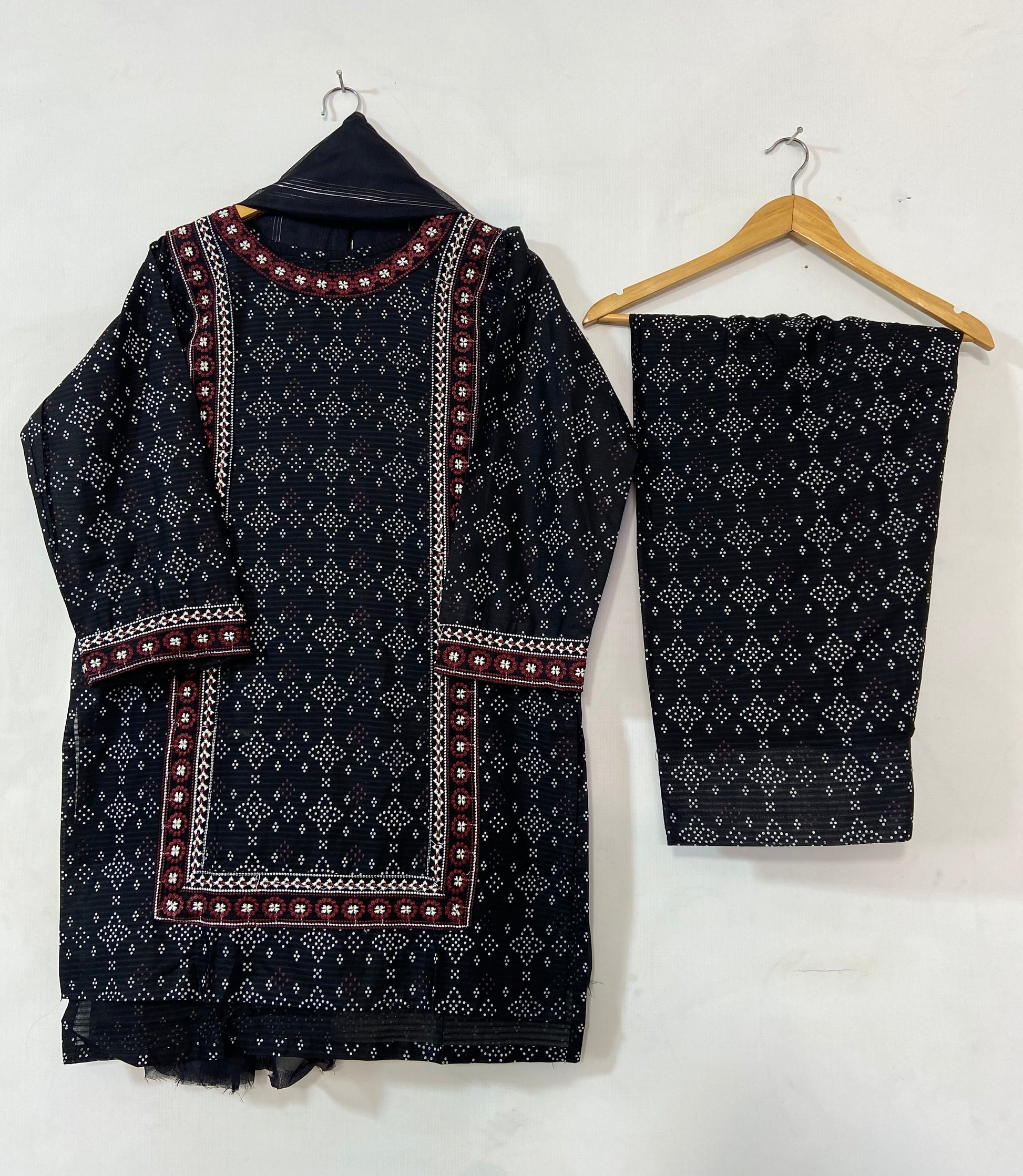 Comfortable Lawn fabric for shirt and trouser, paired with a soft Munar dupatta for added elegance. Ideal for any occasion!