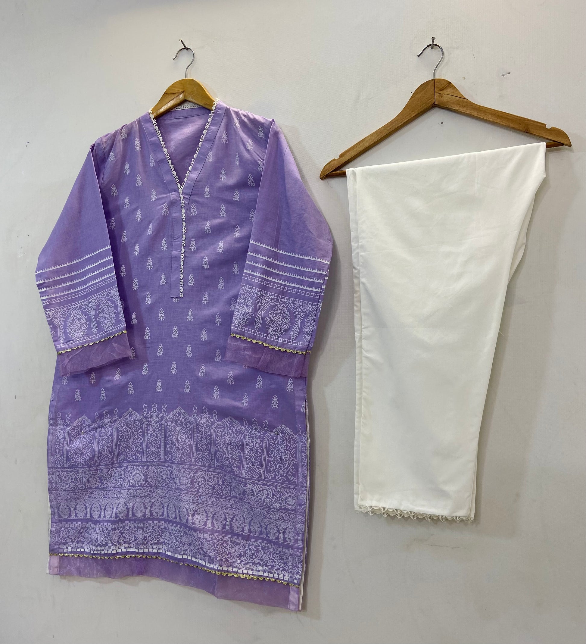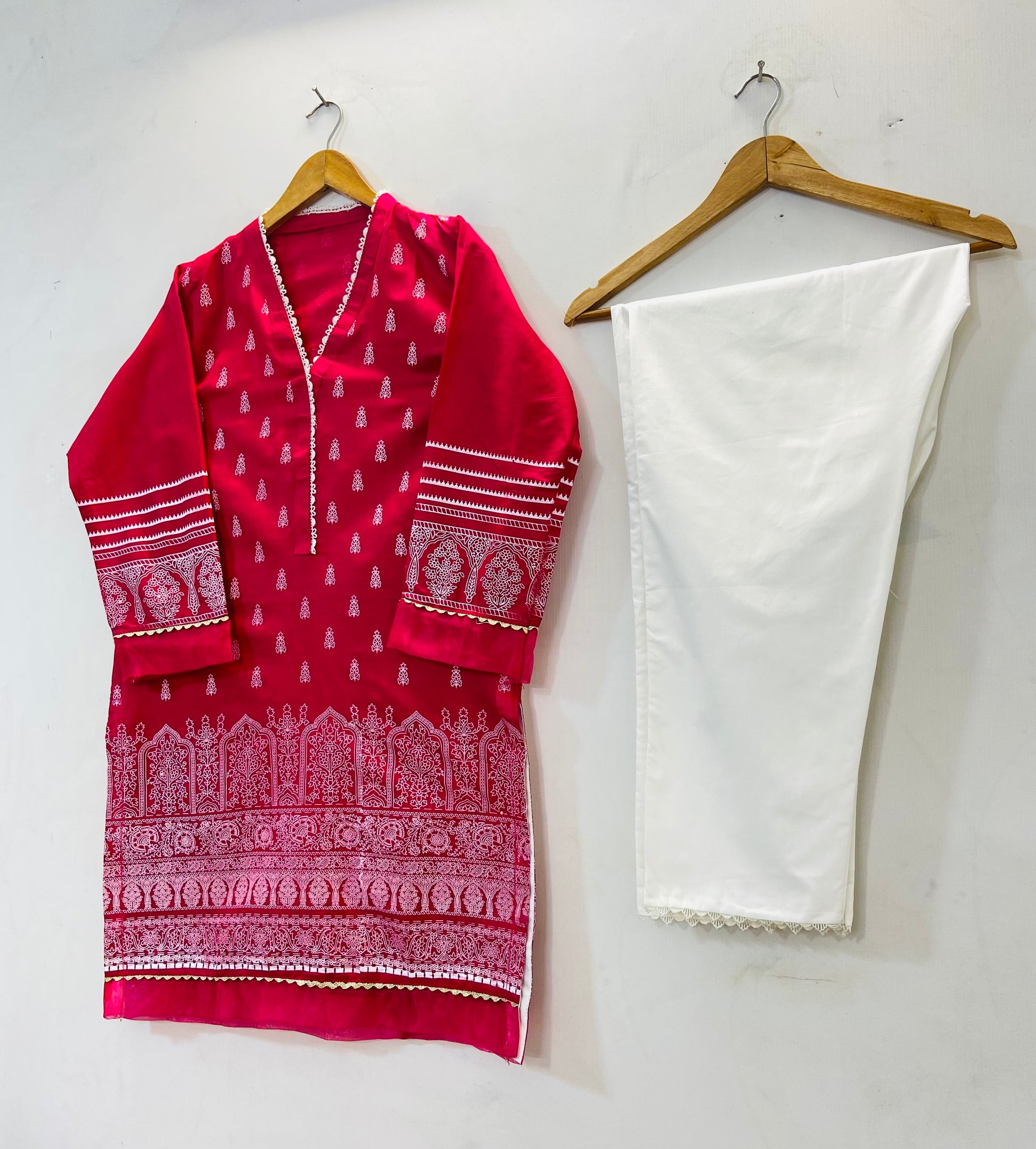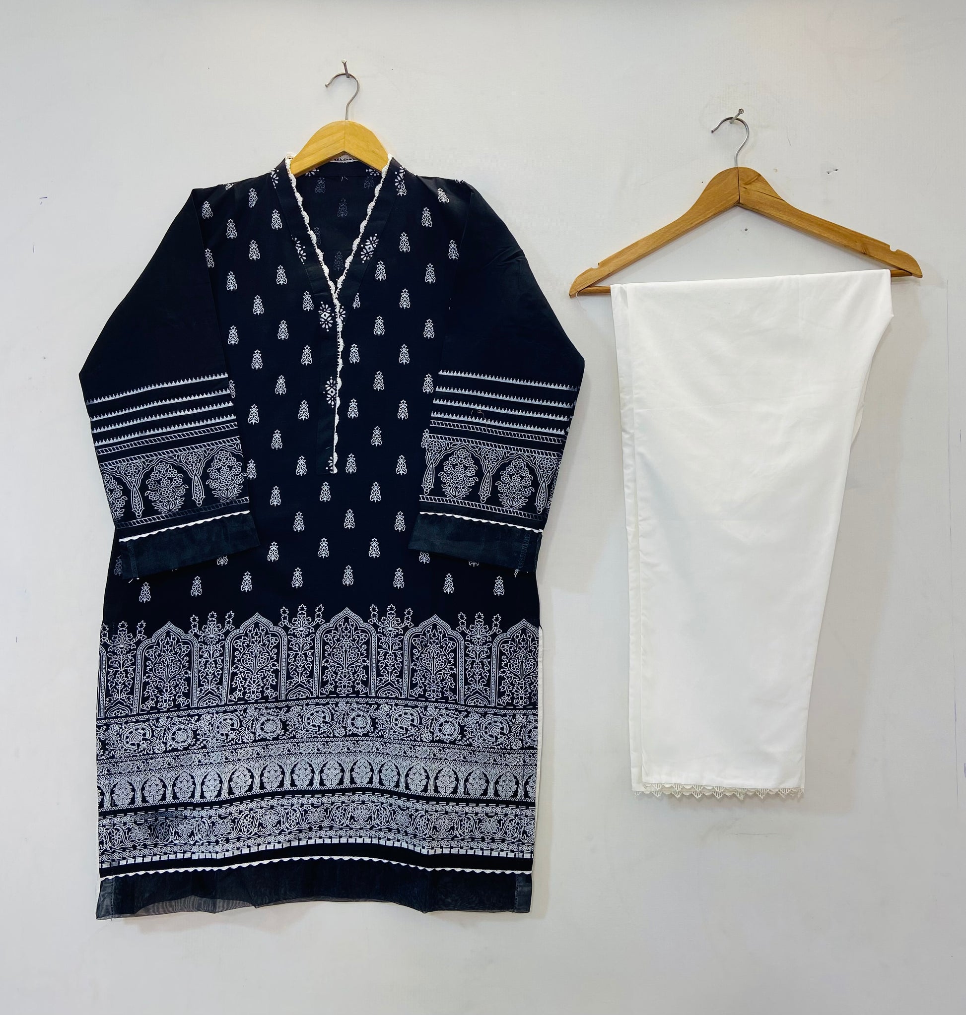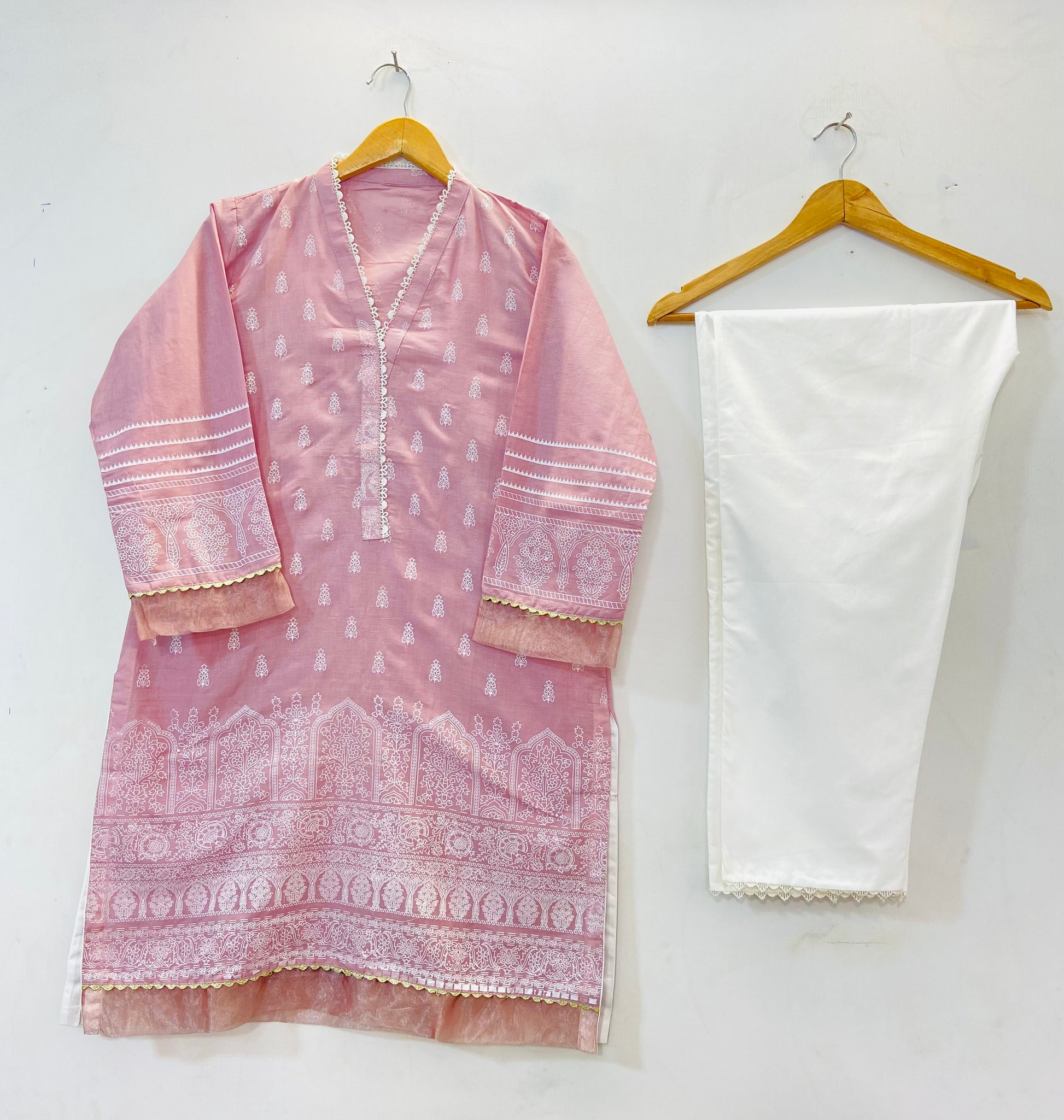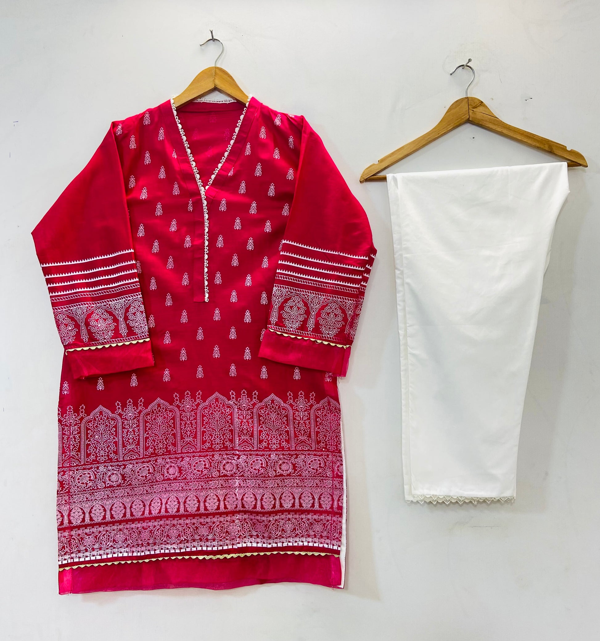 Bareeze lawn fabric 2-piece! Featuring a beautifully paste-printed shirt in vibrant summer hues with intricate joint lace work, paired with a crisp white plain trouser for added elegance.