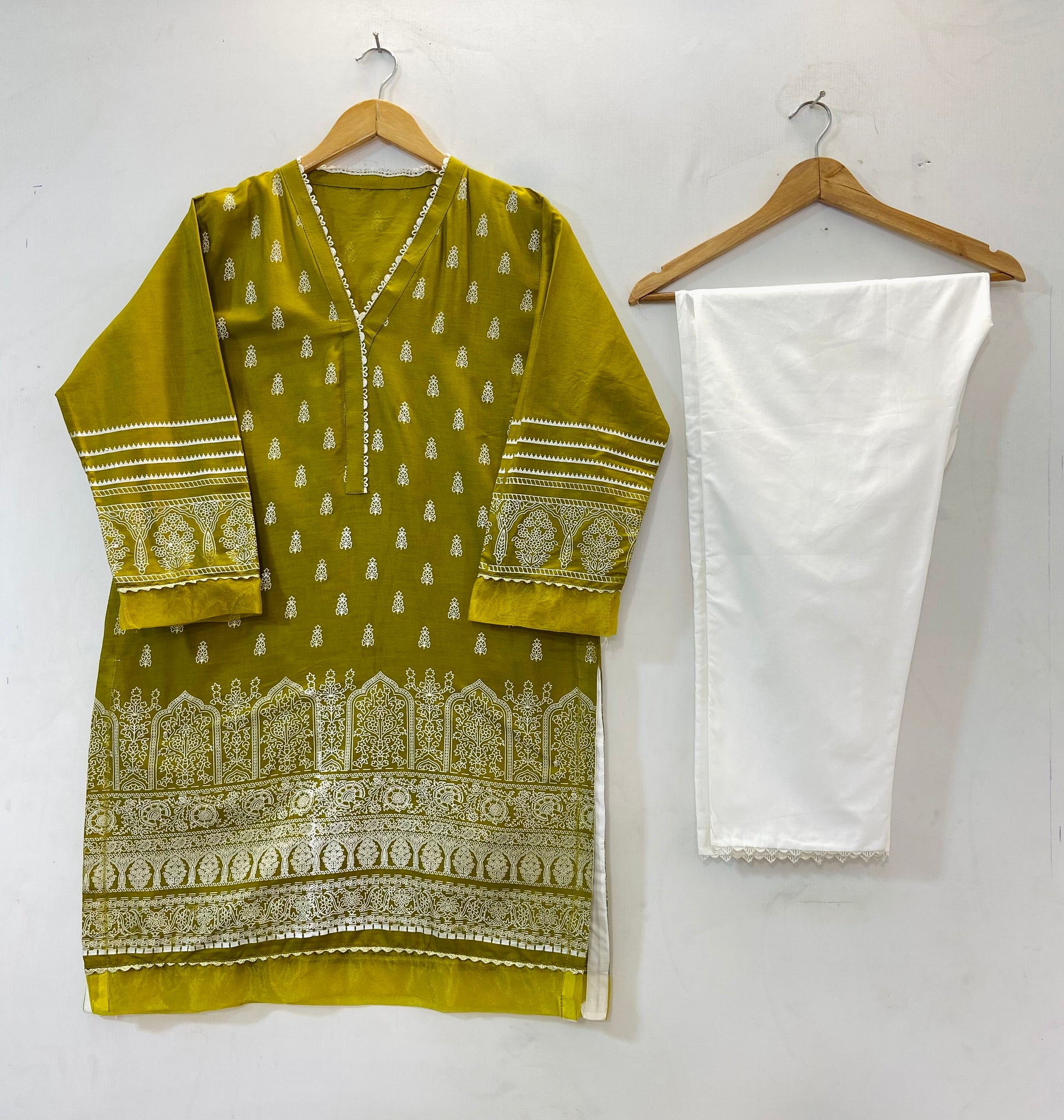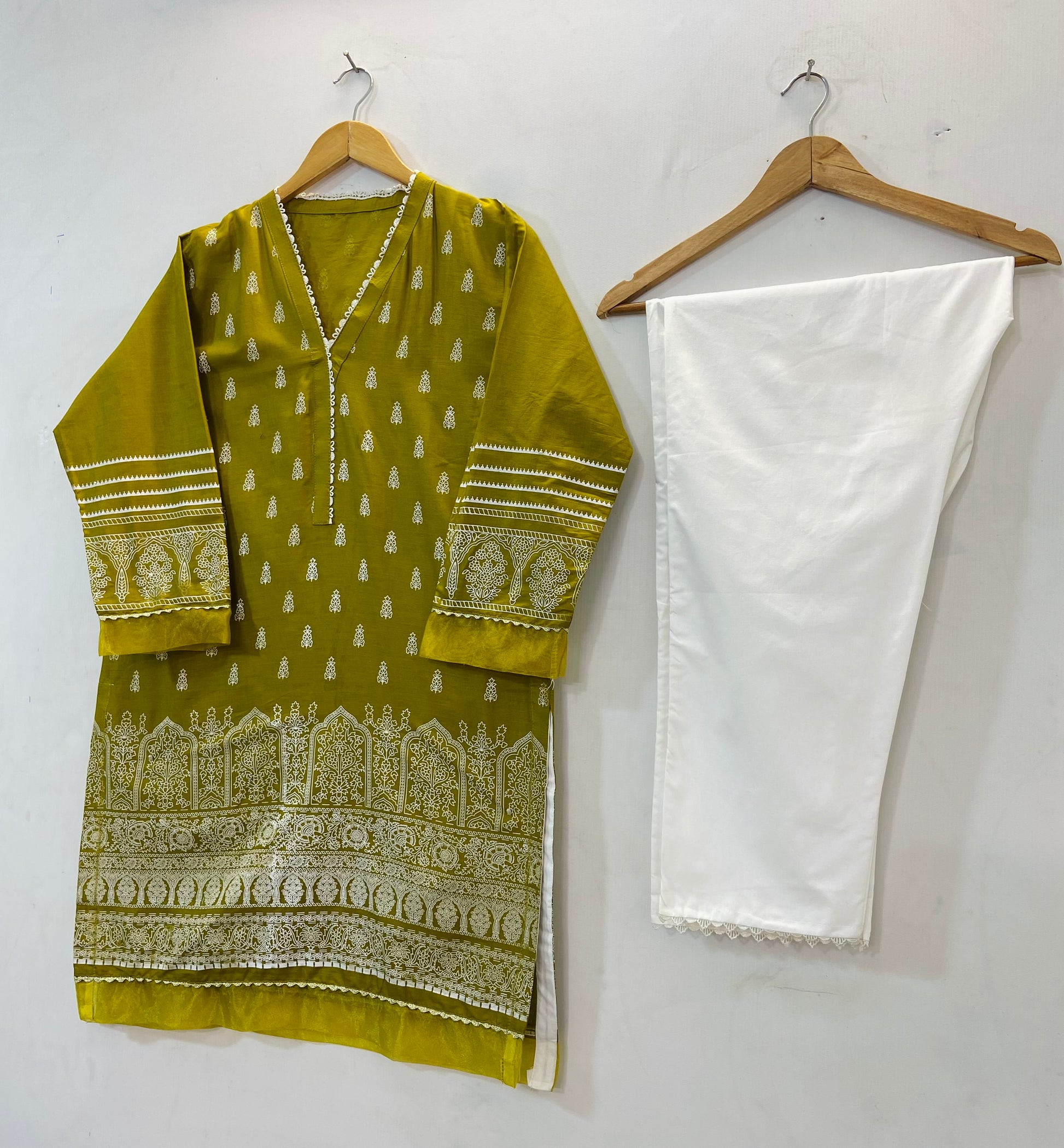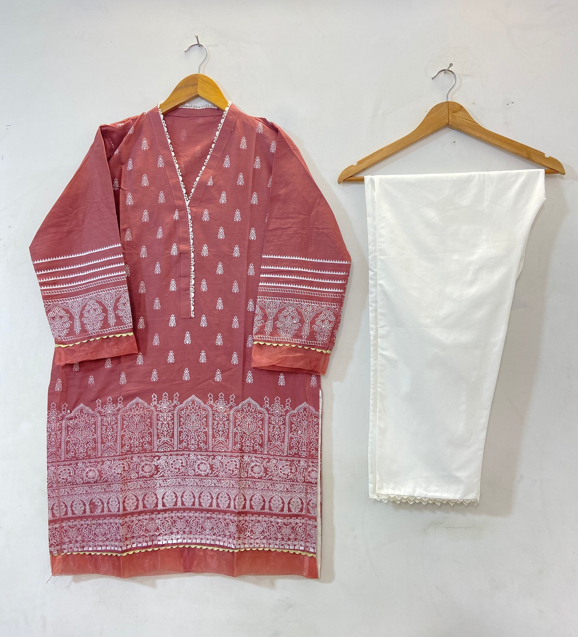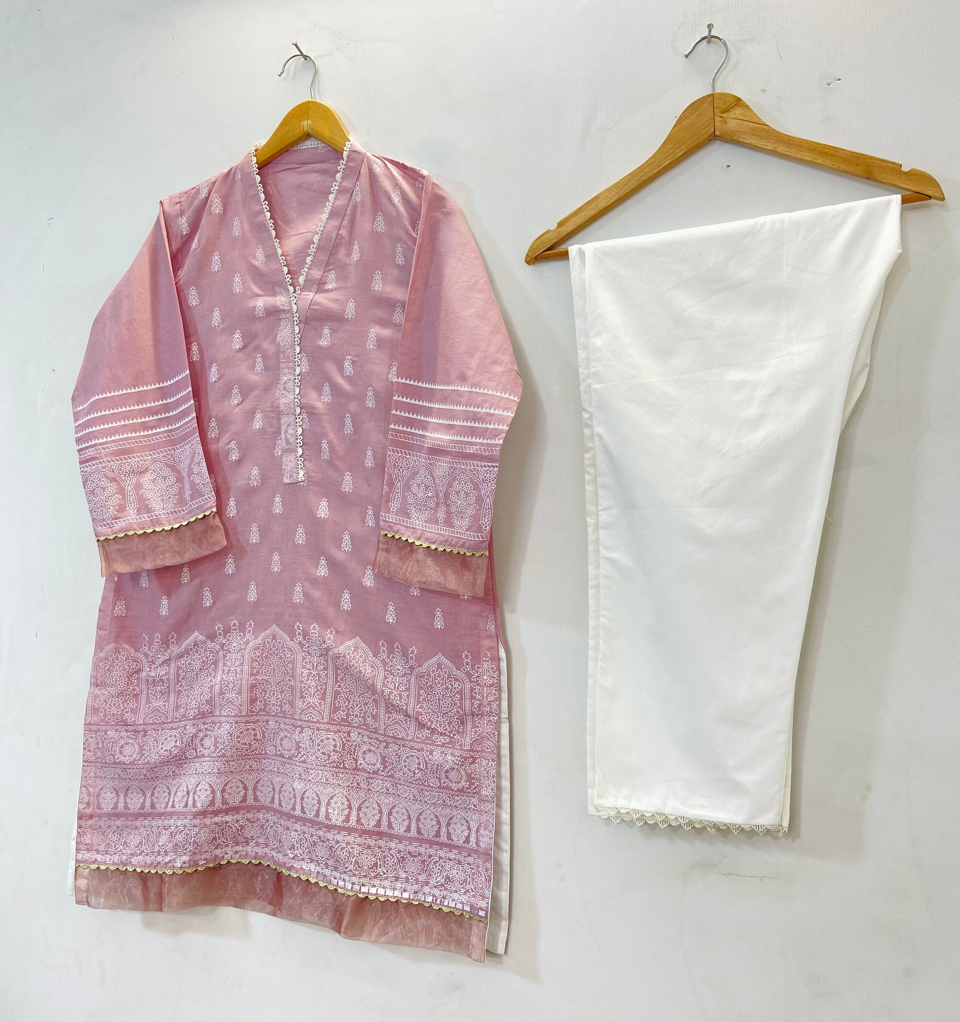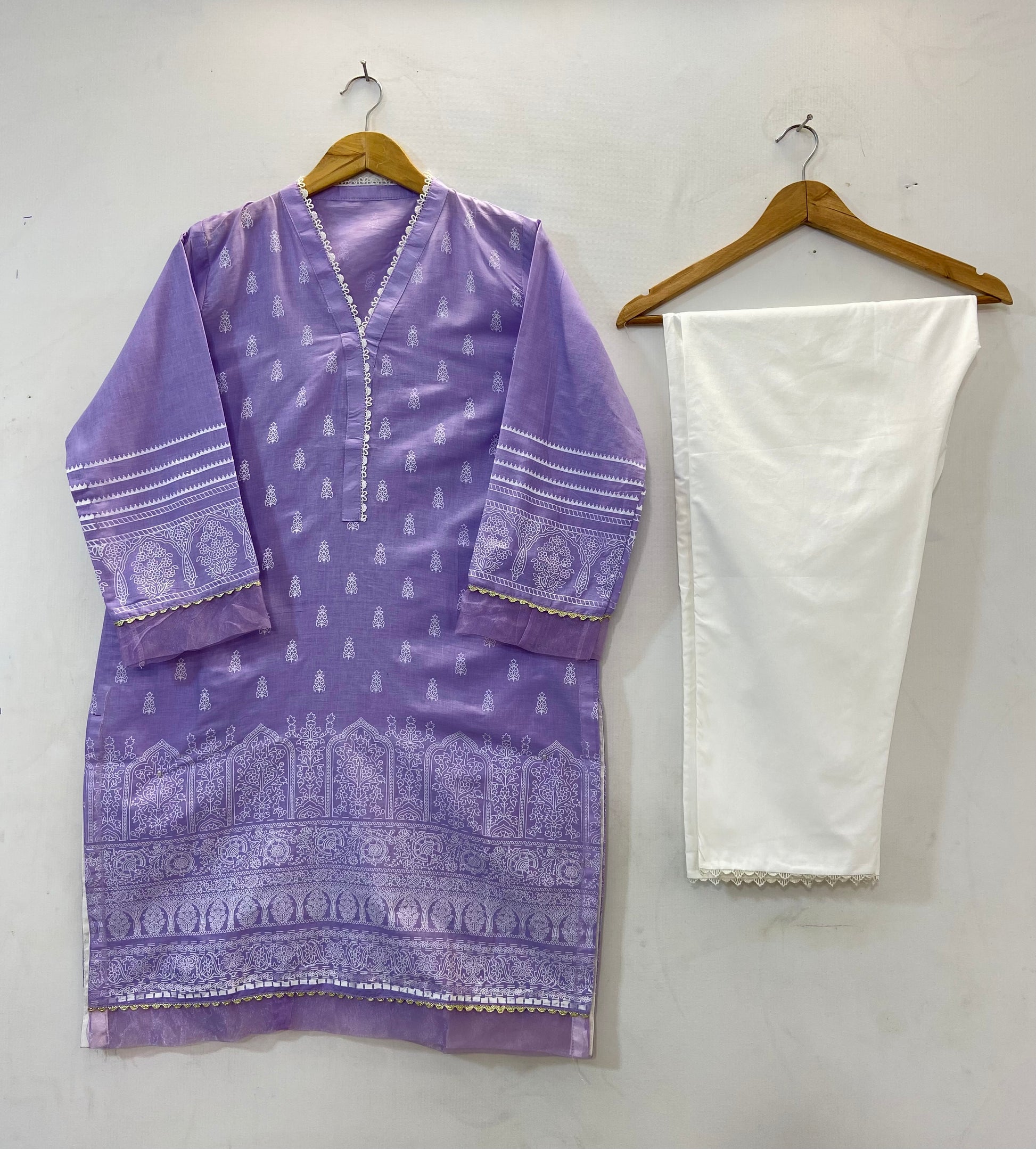 Bareeze lawn fabric 2-piece! Featuring a beautifully paste-printed shirt in vibrant summer hues with intricate joint lace work, paired with a crisp white plain trouser for added elegance.