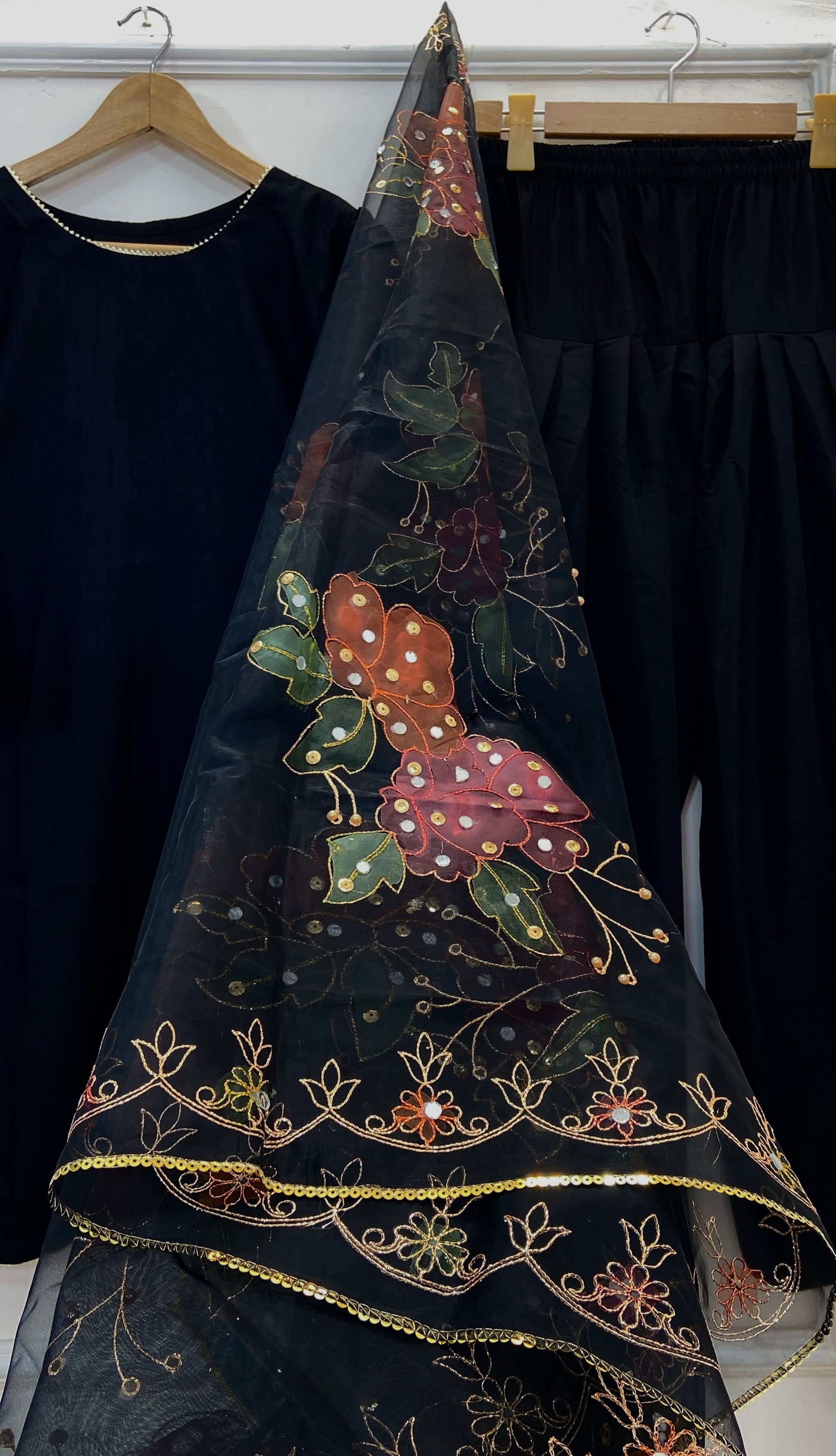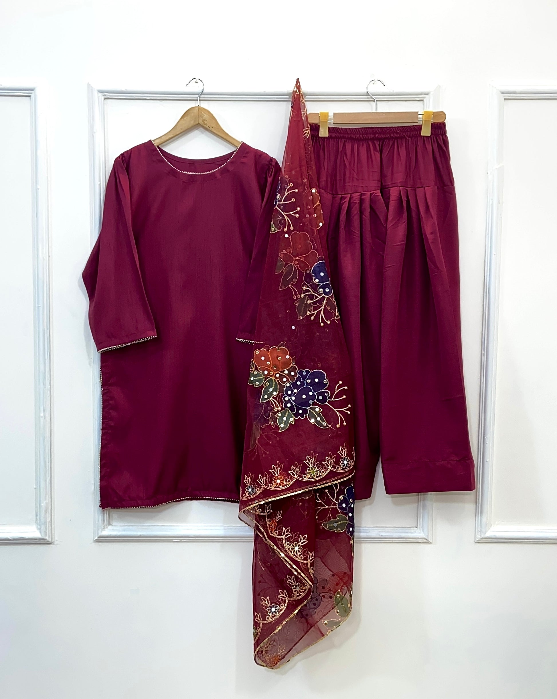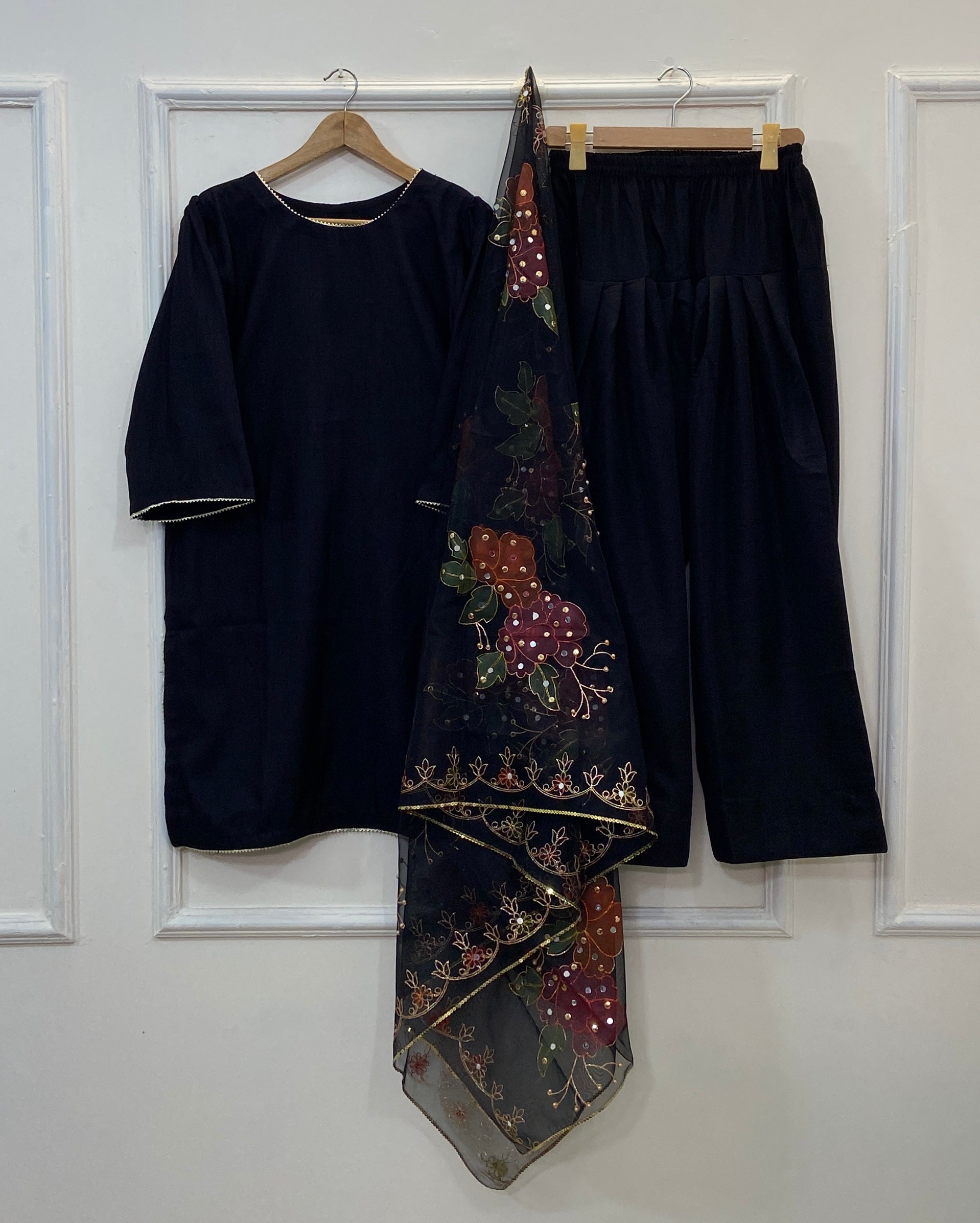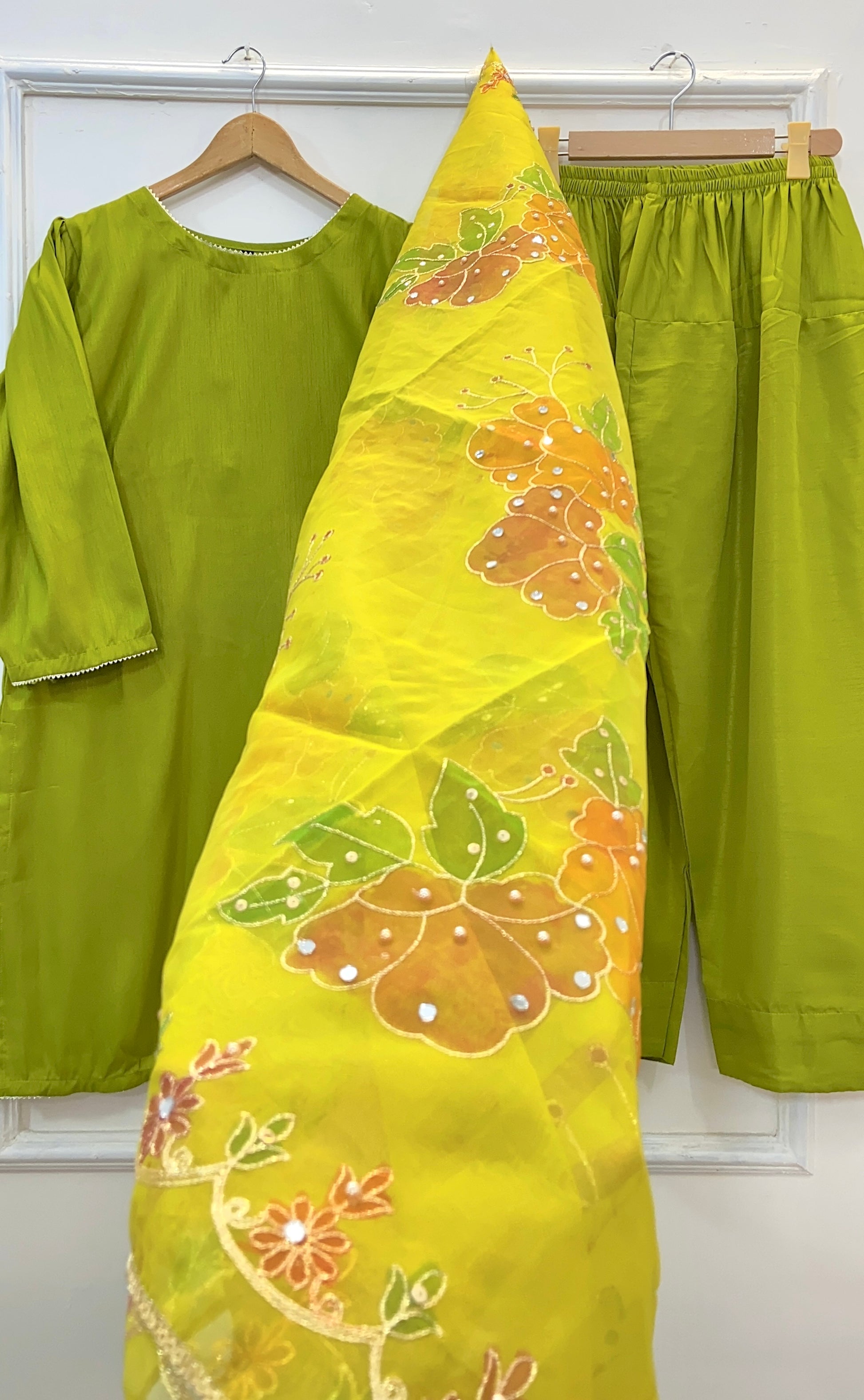 - Stunning 3pc outfit with hand-painted mirror work.